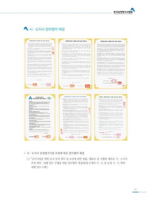 시·도지사 업무협약 체결 ■ 시·도지사 감정평가기관 추천에 따른 업무협약 체결 >>> 「공익사업을 위한 토지 등의 취득 및 보상에 관한 법률」 제68조 및 시행령 제28조 시·도지사 추천 위탁·대행 업무 수행을 위한 업무협약 체결(현재 17개의 시·도 중 15개 시·도 위탁· 대행 업무 수행 ) 43